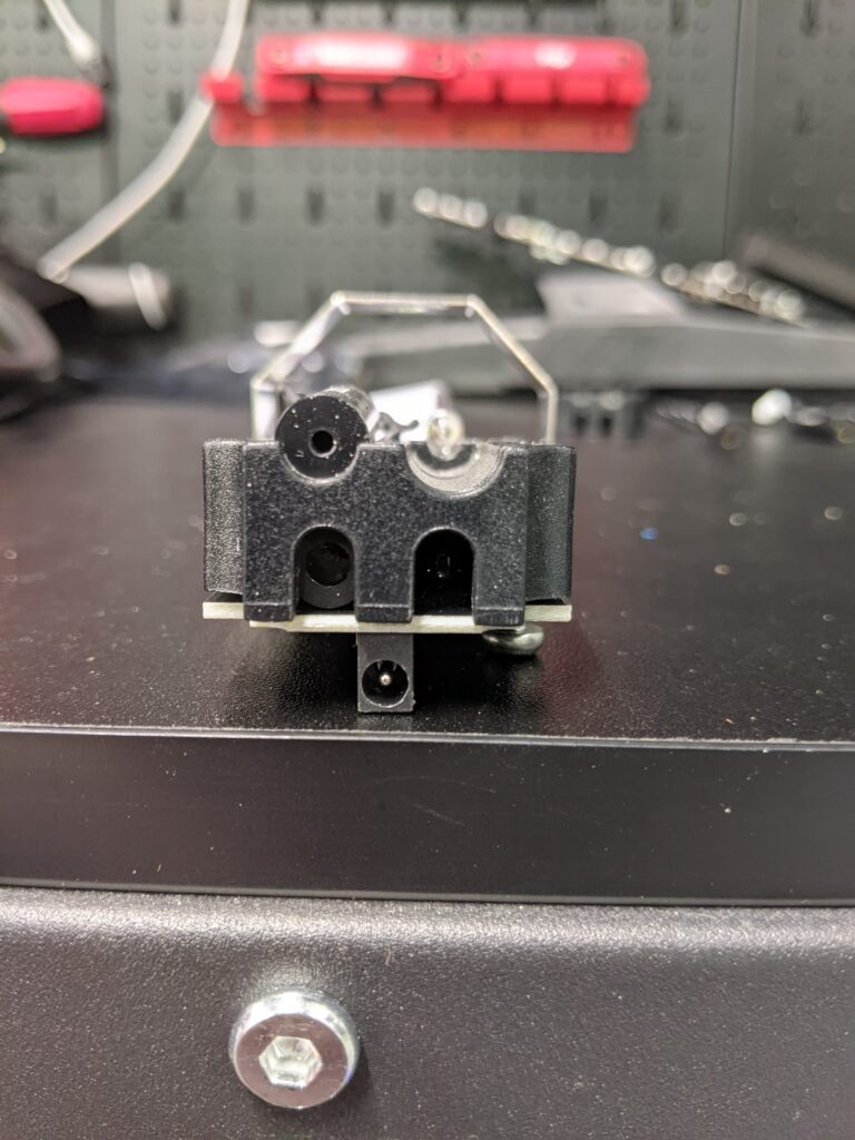 The Optics Block is held in with 4 nylon screws and is located at the front of the phaser. Use a small flat-head screwdriver to undo these. Once they are unscrewed, unplug the cable from the optics block and set it aside.