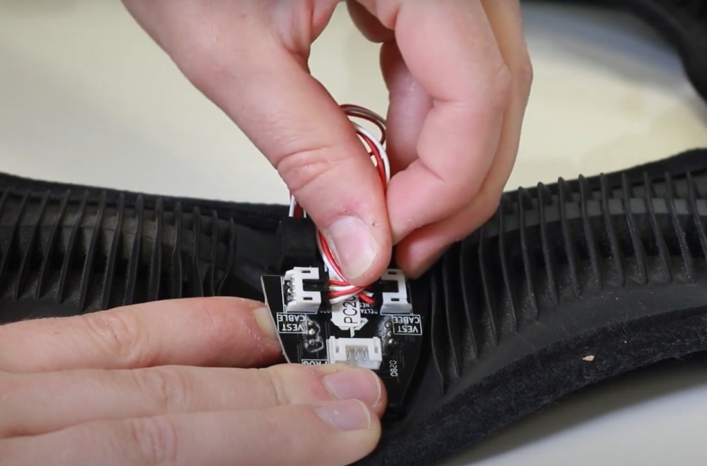 Once the cable is unplugged from both sensors, pull it through the vest. Push your new cable through the vest channel and plug it back into both PCB sockets they were originally plugged into.